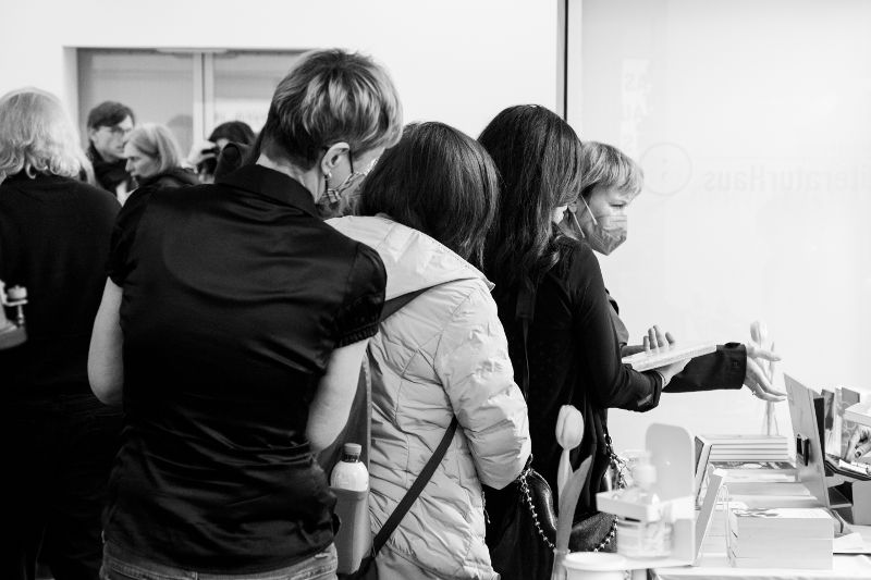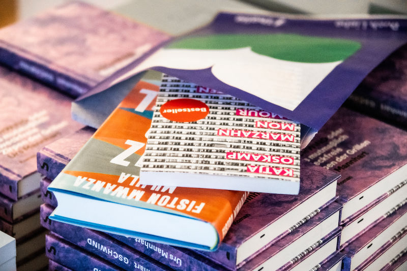 Die Festivaltage boten einen gut mit Büchern der Festival-Autor*innen bestückten Büchertisch von Thalia …
